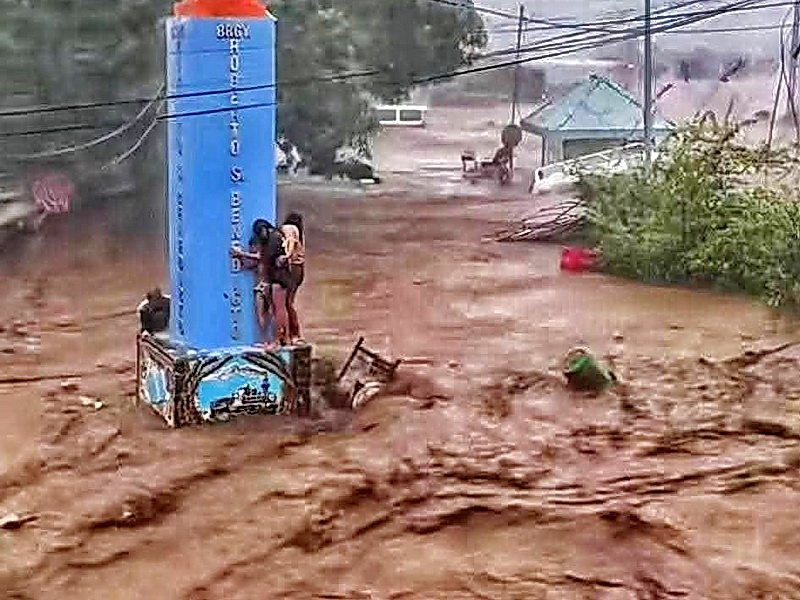 Beberapa orang terlihat sedang bertahan hidup bergantung pada sebuah tugu, di atas arus banjir bandang yang deras. (foto/ist)