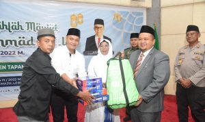 Bupati Tapsel H Dolly Pasaribu saat menyerahkan bantuan Alat Musik Nasyid dan Pengeras Suara kepada BKMT dan sejumlah Masjid di Tapsel usai puncak peringatan Maulid Nabi Muhammad SAW 1444 H, Jum'at (28/10-22). Foto : BP/Ist