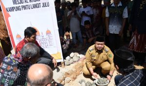 Tapsel-BP : Bupati Tapanuli Selatan H Dolly Pasaribu lakukan peletakan batu pertama pembangunan Masjid Al Ikhsan Kampung Pintu Langit Julu di Desa Huraba Kecamatan Angkola Timur, Senin (27/6-22).