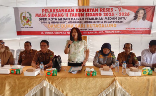 Medan, harianbatakpos.com – Anggota DPRD Kota Medan, Dame Duma Sari Hutagalung, menggelar kegiatan Reses V Masa Sidang II Tahun Sidang 2025–2026 sesi ketiga di Jalan Bunga Cempaka, Kelurahan Titi Rantai, Kecamatan Medan Baru, Senin (22/2/2026) pukul 15.00 WIB.