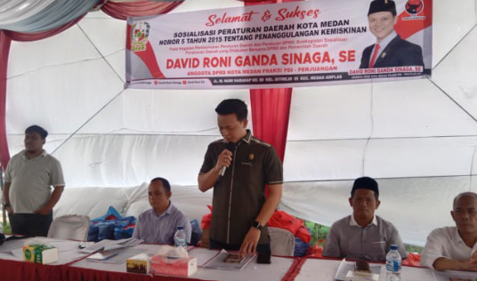 Medan, harianbatakpos.com – Anggota DPRD Kota Medan, David Roni Ganda Sinaga SE menggelar kegiatan Sosialisasi Peraturan Daerah (Perda) Kota Medan Nomor 5 Tahun 2015 tentang Penanggulangan Kemiskinan sesi pertama.
